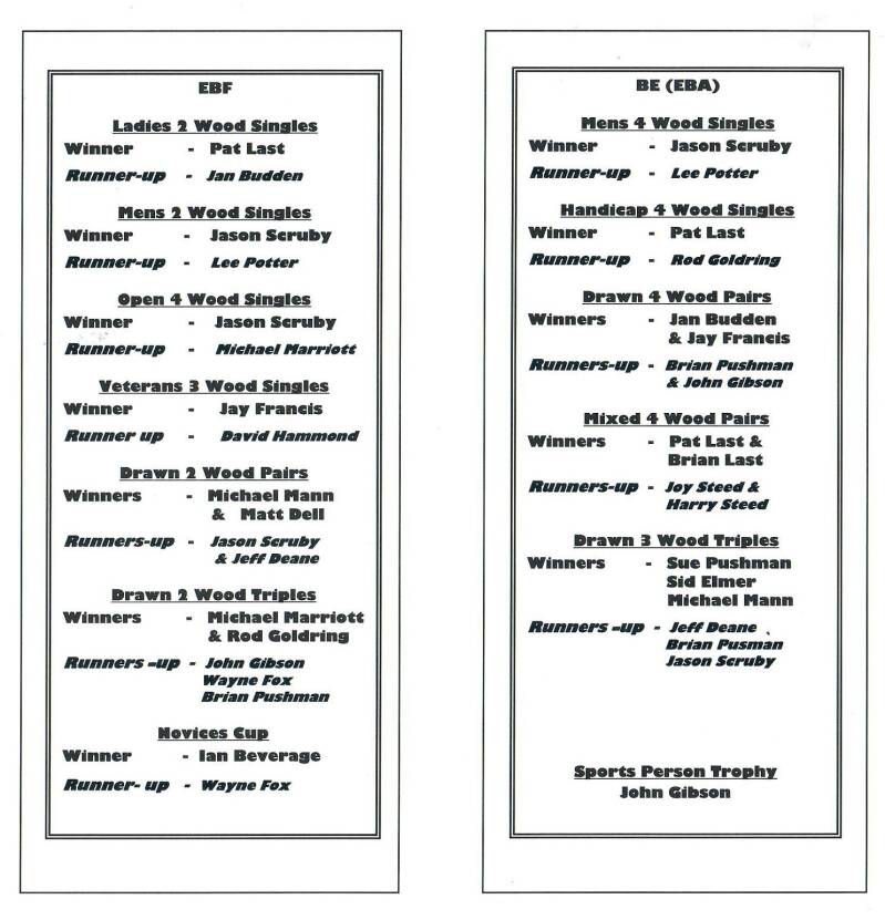 We have a number of interclub competitions open to club members of which the singles and pairs finals took place on the second weekend of September. With Triples matches being played as a one day tournament earlier in the year. The Roll of Honour for 2024 is............